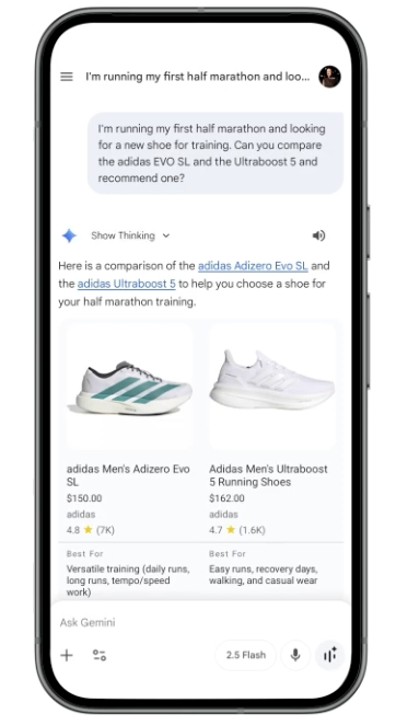 L’application Gemini intègre désormais des fonctionnalités d’achat alimentées par le Shopping Graph, permettant d’aller rapidement de l’idée initiale à la consultation d’offres concrètes.
