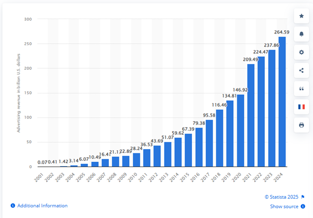 Capture d’écran Statista, novembre 2025Les expérimentations de Google incluent désormais l’affichage d’annonces au sein des AI Overviews, ce qui a déjà entraîné une hausse des ventes d’espaces publicitaires sur Search. Il est probable que des formats payants similaires apparaissent pour le AI Mode, optimisés par une meilleure compréhension de l’intention utilisateur.