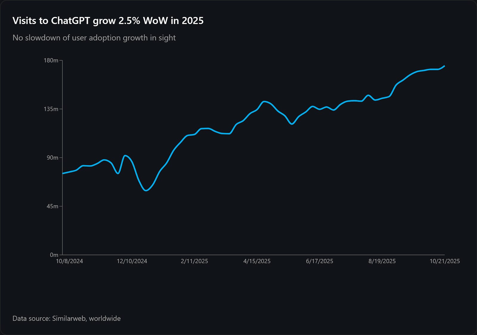 - Plus récemment, le taux de croissance mensuel du trafic LLM a ralenti : il est passé de 25,1 % en 2024 à 10,4 % en novembre 2025.