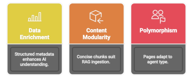 3. Polymorphisme : une même page peut proposer des variantes optimisées selon le type d’agent qui la consulte. Un agent dédié au shopping n’a pas les mêmes attentes qu’un agent médical : le contenu doit donc pouvoir prendre différentes formes (angles prix/performance/sécurité, niveaux de détail, formats multimédias).