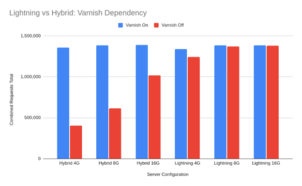 Lorsque Koddr a désactivé Varnish, la pile hybride a perdu 71% de sa performance, révélant sa forte dépendance au caching pour la plupart du trafic. La pile optimisée n’a chuté que de 7%, ce qui démontre sa capacité à maintenir la vitesse même lorsque les requêtes ne sont pas mises en cache (logged-in sessions).